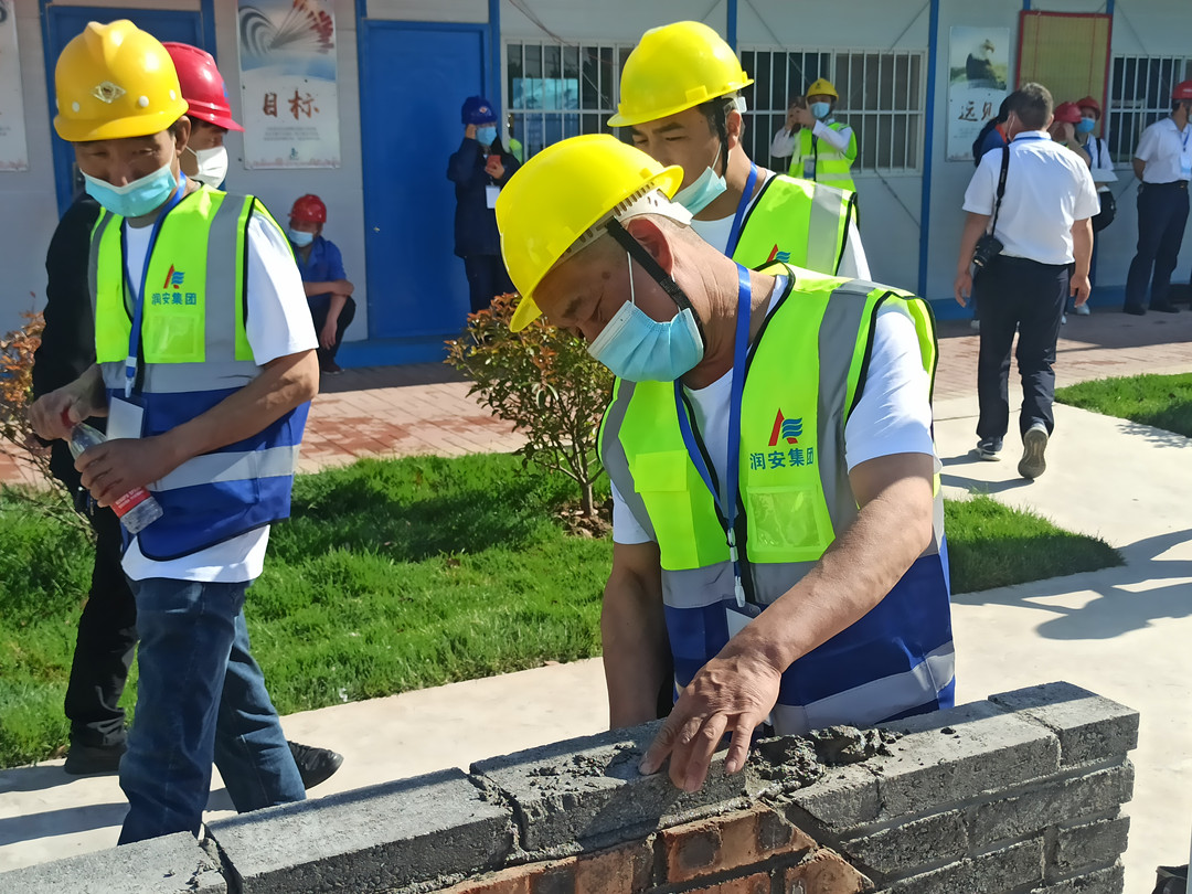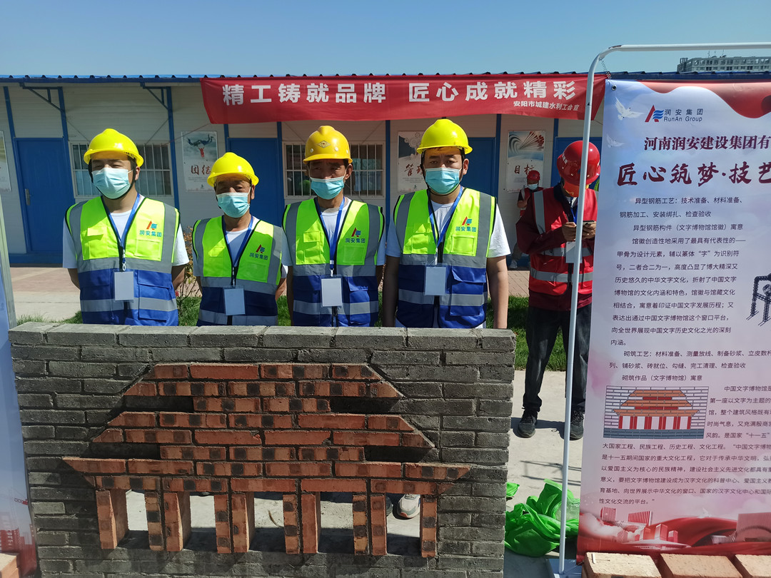 本次技能展示活動(dòng)設(shè)置了鋼筋綁扎和砌筑兩個(gè)項(xiàng)目,我公司派遣八名職工代表參加了本次技能展示,選手們身著統(tǒng)一工作服,以嫻熟的操作技能展現(xiàn)了過硬的技術(shù)水平。砌筑工速度與質(zhì)量并重,一手拿著泥刀,一手不停地一塊塊砌磚,每一道工序、每一個(gè)細(xì)節(jié)都力求做到完美,最終圓滿完成了砌筑作品《文字博物館》。鋼筋工粗中有細(xì),在大面積作業(yè)的同時(shí),即時(shí)進(jìn)行細(xì)節(jié)處理,確保作品垂直、平整,經(jīng)過一系列的復(fù)雜操作,一個(gè)完美的安陽(yáng)文字博物館館徽便呈現(xiàn)在眼前。高超的技藝水平贏得了領(lǐng)導(dǎo)和現(xiàn)場(chǎng)觀眾的一致稱贊。